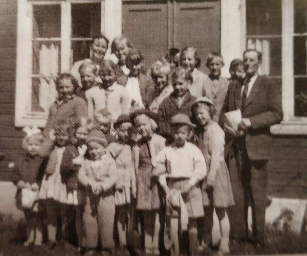 1952 började jag i Ronehamns skola där jag gick första och andra klass under Sandra Wikstens sista år som lärare innan hon gick i pension. Då hade vi med oss matsäck från hemmet. På bilden är det jag vid frökens vänstra sida.