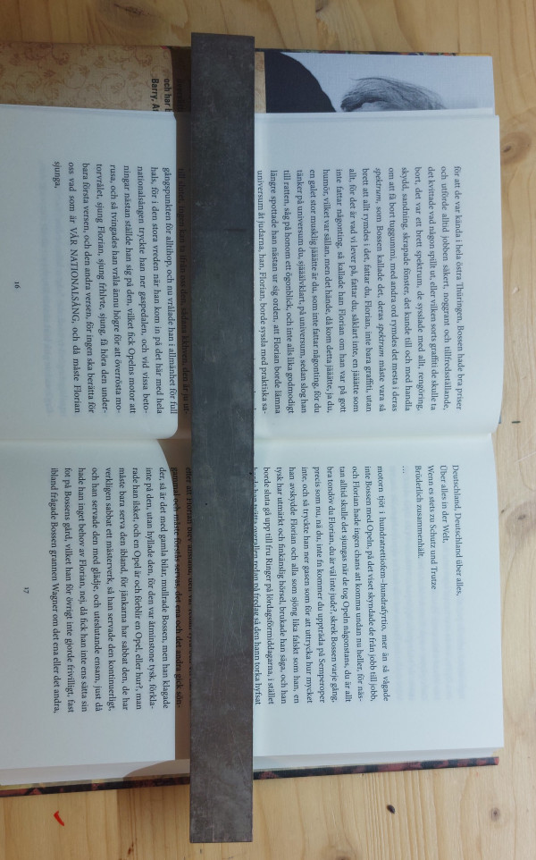 Fick en bok i 80-års present. Då jag har amputerat min vänster arm har jag svårt med fysiska böcker, men med en tung metallskena, som kan flyttas upp och ner på sidorna löste jag problemet.