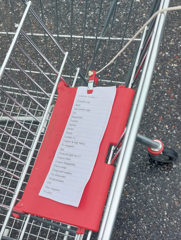 Har ett dokument med alla livsmedel som finns hemma sorterad på plats i hemmet. Inför veckohandling onsdagar ( pensionärsrabatt 5 % på ICA tisdagar och onsdagar) noterar vad som saknas och sorterar om till hur jag går på ICA. Använder åter igen en klämma för att fästa listan på sätet för barn. I snöret i andra änden finns en penna som används för att stryka det som plockas i vagnen. Jag lägger varan först på listan för att skanna varan.